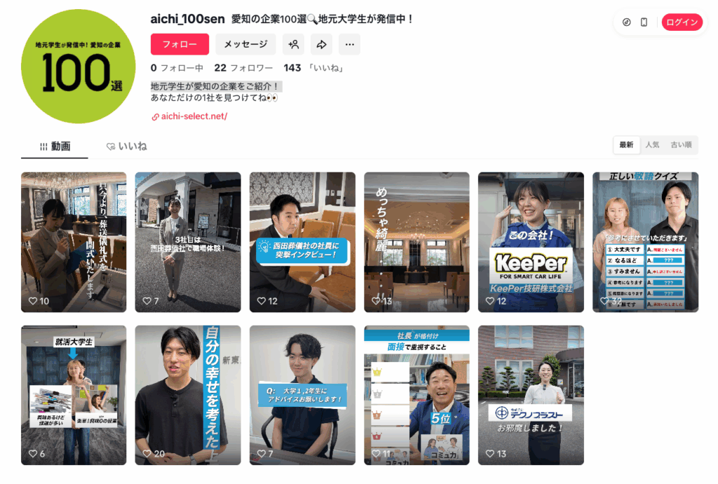 「学生が選ぶ愛知の企業100選」Tik Tokの配信を開始しました。冊子だけでなく、こちらも地元愛知の大学生が発信中です!冊子と合わせてこちらも、ぜひ、ご覧ください。